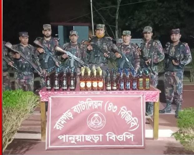 চট্টগ্রামের ফটিকছড়ি উপজেলা ভুজপুর থানার পানুয়াছড়া সীমান্ত এলাকায় অভিযান চালিয়ে ১১৮ বোতল বিভিন্ন ব্র্যান্ডের বিদেশি মদ উদ্ধার করেছে বর্ডার গার্ড বাংলাদেশ (বিজিবি)।