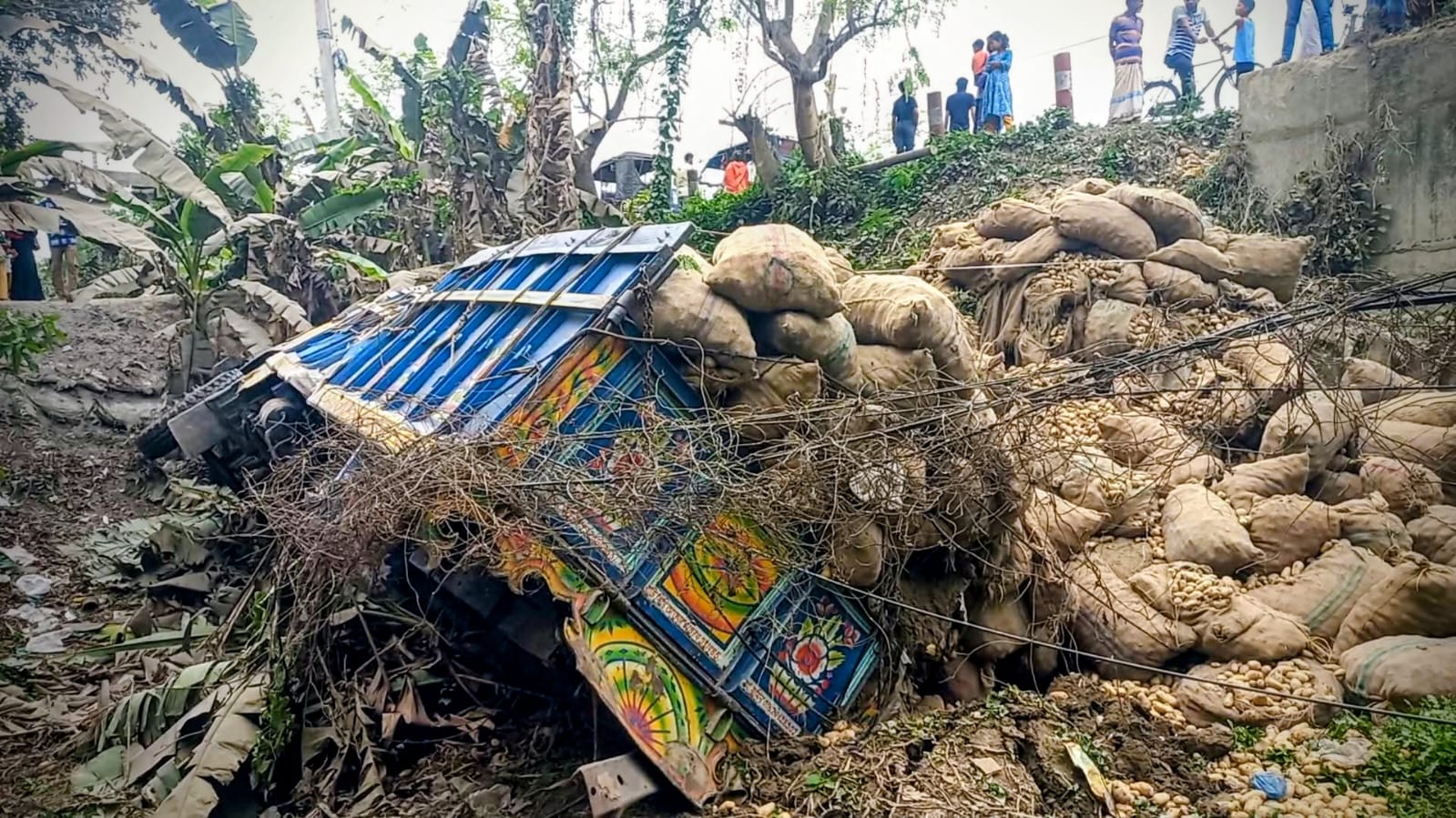 তিনি আরও জানান, বিকট শব্দ শুনে স্থানীয়রা ছুটে গিয়ে দেখতে পান সজীব ট্রাক ও আলুর বস্তার নিচে চাপা পড়ে আছেন এবং চালক ট্রাকের ভেতরে আহত অবস্থায় পড়ে আছেন। স্থানীয়রা চালককে উদ্ধার করে প্রাথমিকভাবে মাথায় পানি ঢেলে সুস্থ করার চেষ্টা করেন। পরে তিনি একটি মাহেন্দ্র গাড়িতে করে সেখান থেকে চলে যান।