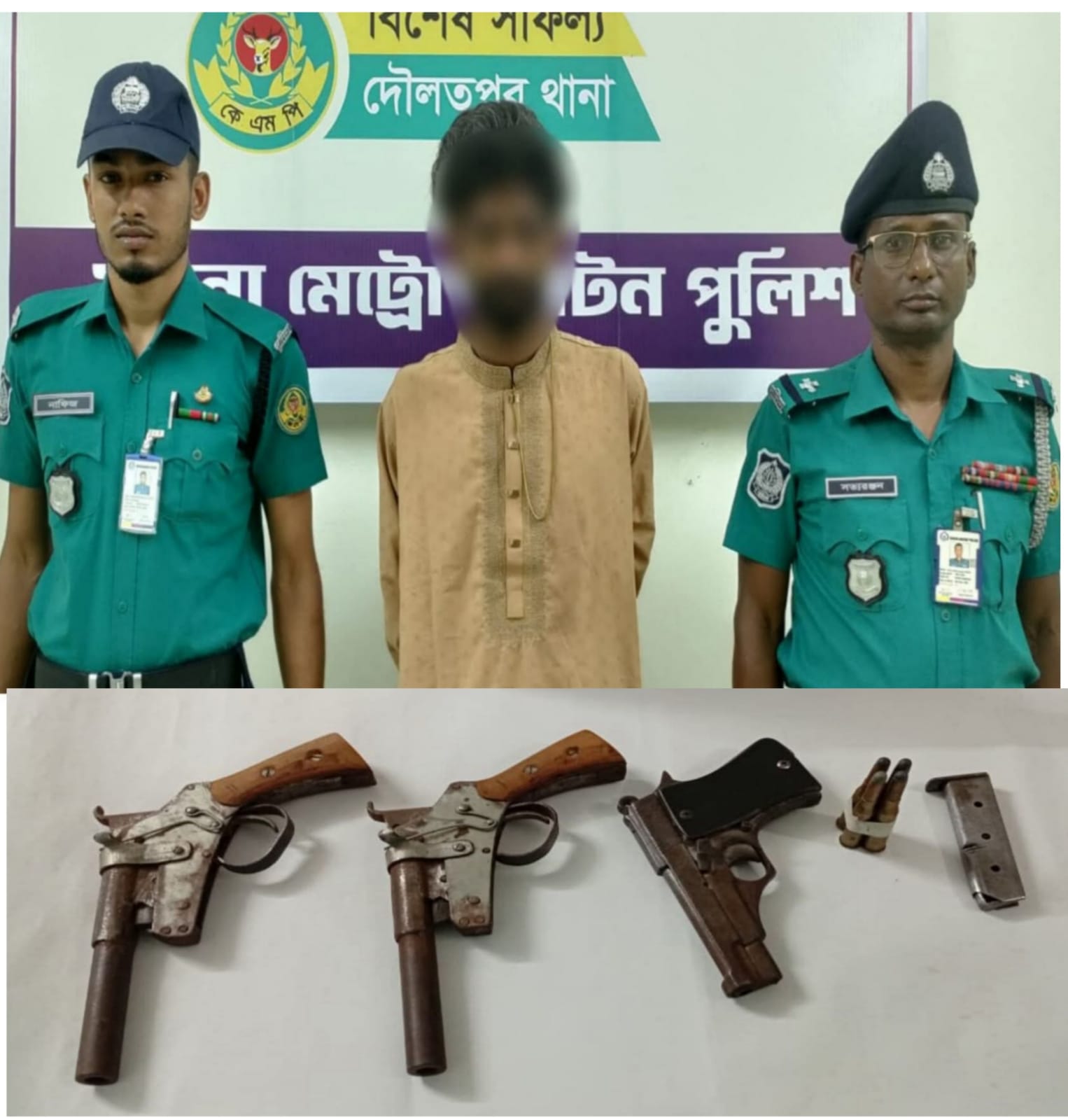 পুলিশ জানায়, গোপন সংবাদের ভিত্তিতে দৌলতপুরের রায়েরমহল এলাকায় অভিযান চালিয়ে ইমন হাওলাদার ওরফে গজাল ঈমন (২৪)-কে গ্রেফতার করা হয়। পরে তার দেয়া তথ্যের ভিত্তিতে মহেশ্বরপাশা এলাকার কার্তিককূল উত্তর ঘোষপাড়া এলাকায় অভিযান চালিয়ে ২টি ওয়ান শুটার গান, ১টি পিস্তল, ১টি ম্যাগাজিন এবং কয়েক রাউন্ড গুলি উদ্ধার করা হয়েছে।