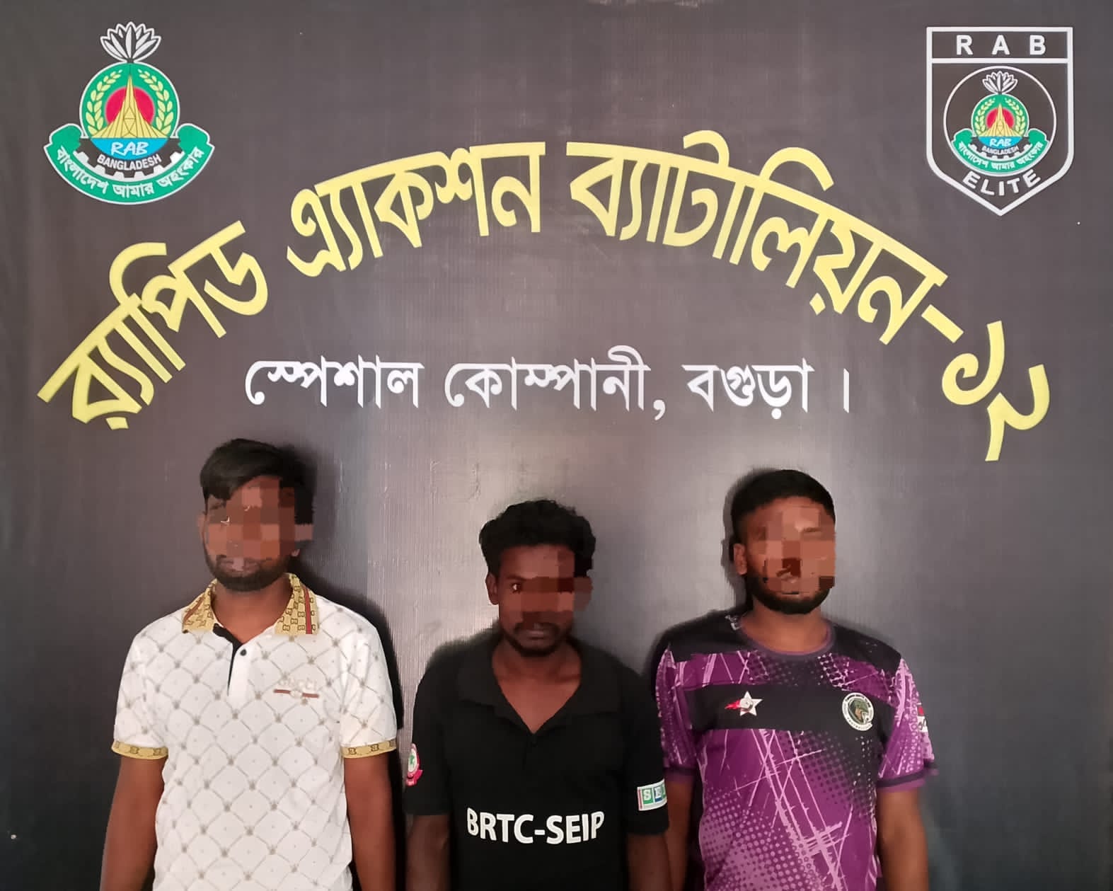মঙ্গলবার (৭ এপ্রিল) ভোররাত পৌনে ৪টার দিকে শহরের চকসূত্রাপুর চামড়ার গুদাম এলাকার হরিজন কলোনিতে এই অভিযান চালানো হয়। গ্রেপ্তার ব্যক্তিরা হলেন: সনি বাশফোড় (৩০), আকাশ হরিজন (২৫) ও পিলু হরিজন (৩০)। তাঁদের সবার বাড়ি চক সূত্রাপুর হরিজন কলোনী এলাকায়। র্যাব জানায়, গোপন সংবাদের ভিত্তিতে তারা জানতে পারে, ওই এলাকায় একটি বাড়িতে মাদকদ্রব্য কেনাবেচা হচ্ছে। পরে ভোররাতে অভিযান চালিয়ে ওই তিনজনকে আটক করা হয়। এ সময় তাঁদের কাছ থেকে ৬৫ কেজি গাঁজা ও ৪ লিটার দেশীয় কেরু মদ উদ্ধার করা হয়। এছাড়া মাদক ব্যবসায় ব্যবহৃত একটি স্মার্টফোন, একটি সিম কার্ড এবং ২০৫ টাকা জব্দ করা হয়। র্যাব-১২ এর কোম্পানি কমান্ডার স্কোয়াড্রন লিডার ফিরোজ আহমেদ বলেন ব্যক্তিদের বিরুদ্ধে আইনগত ব্যবস্থা নিতে তাঁদের বগুড়া সদর থানায় হস্তান্তর করা হয়েছে।