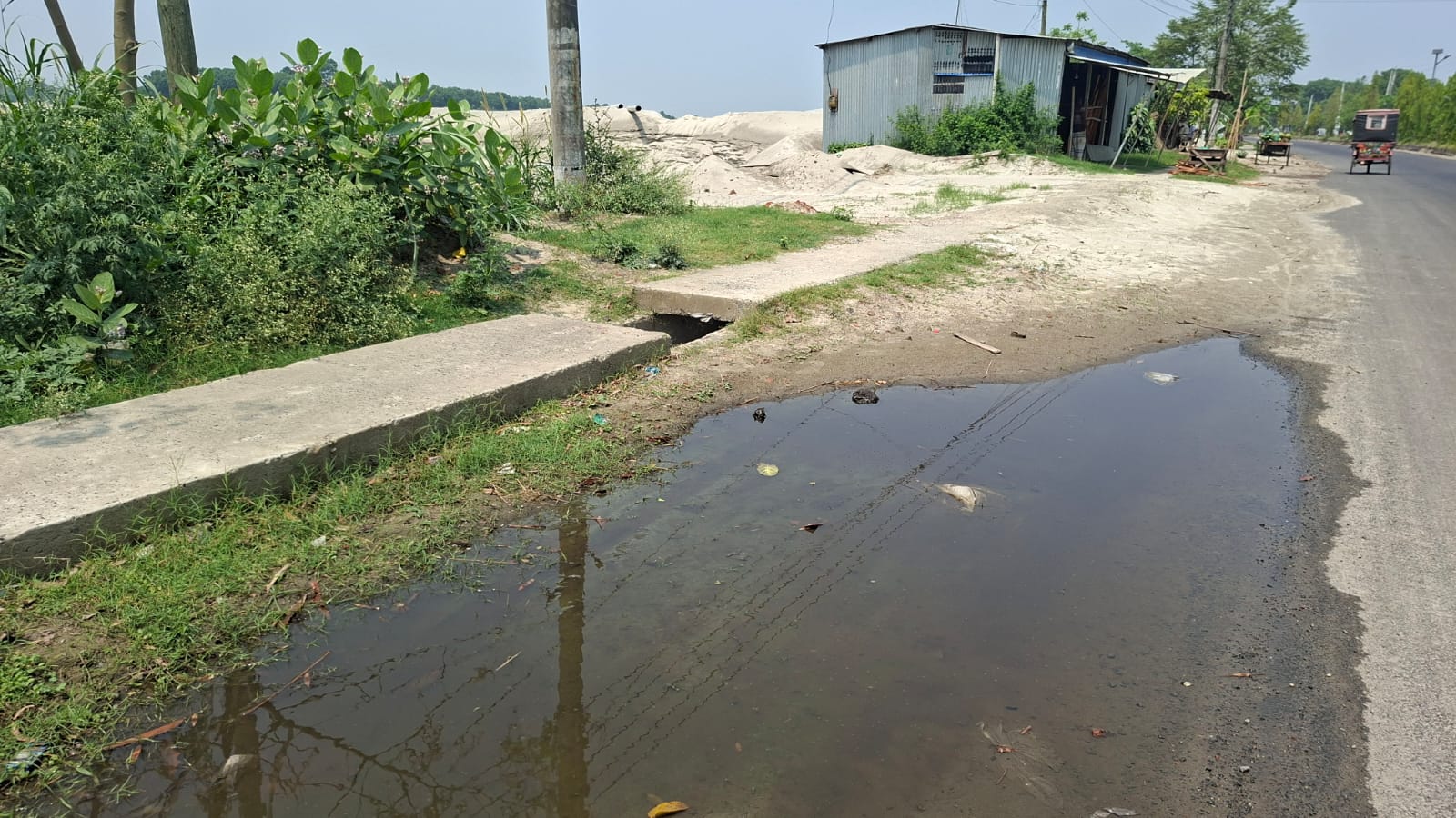 ঢাকা-খুলনা মহাসড়কের দৌলতদিয়ার বাংলাদেশ হ্যাচারিচ থেকে দৌলতদিয়া ঘাট পর্যন্ত চার কিলোমিটার এলাকায় রয়েছে ফোরলেন সড়ক। যার আগে ও পিছনে বাদ দিয়ে মাঝে ১ হাজার ২০০ মিটার এলাকায় ড্রেন নির্মাণ করেছে সড়ক ও জনপথ বিভাগ। ঠিকাদারী প্রতিষ্ঠান সাইদুর রহমান কনস্ট্রাকশন কাজটি শেষ করেছে গত বছরের ডিসেম্বর মাসে। মূল সড়ক থেকে উচু ড্রেন ও পানি নিষ্কাশনের ব্যবস্থা না থাকায় সামান্য বৃষ্টিতেই সড়কেই জমছে পানি। মাঝে মধ্যেই ঘটছে ছোট-বড় দুর্ঘটনা। ময়লা আবর্জনাযুক্ত পানিতে নষ্ট হচ্ছে পথচারীদের জামা কাপড়।