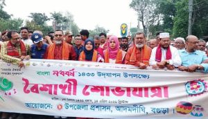 বগুড়ার আদমদীঘিতে উপজেলা প্রশাসনের উদ্যোগে নানা আয়োজনের মধ্য দিয়ে উদযাপিত হয়েছে বাংলা নববর্ষ ১৪৩৩। মঙ্গলবার সকাল ৯টায় জাতীয় সংগীত ও ‘এসো হে বৈশাখ’ সংগীত পরিবেশনের মাধ্যমে শুরু হয় নববর্ষের শুভ সূচনা। এই উপলক্ষে উপজেলা নির্বাহী অফিসার মাসুমা বেগমের সভাপতিত্বে পরিষদ চত্বর থেকে এক বর্ণাঢ্য আয়োজনে বৈশাখী শোভাযাত্রা বের করা হয়। শোভাযাত্রাটি বাসস্ট্যান্ড ঘুরে পুনরায় পরিষদ চত্বরে এসে শেষ হয়। এতে অংশগ্রহণ করেন সাংসদ আব্দুল মহিত তালুকদার, উপজেলা সহকারী কমিশনার (ভূমি) মাহমুদা সুলতানা, উপজেলা মৎস্য অফিসার নাহিদ হোসেন, থানার অফিসার ইনচার্জ কামরুজ্জামান মিয়া, উপজেলা প্রকৌশলী রিপন কুমার সাহা, উপজেলা বিএনপির সহ-সভাপতি আব্দুল মুক্তাকিন তালুকদার, সাধারণ সম্পাদক আবু হাসান, জেলা সমাজকল্যাণ বিষয়ক সম্পাদক মাহফুজুল হক টিকন, উপজেলা জামায়াতে ইসলামীর আমির আতোয়ার হোসেন, ইউপি চেয়ারম্যান ও সদস্যসহ উপজেলার বিভিন্ন দফতরের কর্মকর্তা-কর্মচারী, শিক্ষক-শিক্ষার্থী, নানা শ্রেণি-পেশার মানুষ। শোভাযাত্রা শেষে অনুষ্ঠিত হয় মনোজ্ঞ সাংস্কৃতিক অনুষ্ঠান যা উৎসবে যোগ করে বাড়তি প্রাণচাঞ্চল্য। পাশাপাশি আদমদীঘি ঈশ্বর পূর্ণ জয় পাইলট উচ্চ বিদ্যালয় মাঠে আয়োজন করা হয়েছে ৭ দিনব্যাপী বৈশাখী মেলা, যেখানে স্থানীয় সংস্কৃতি ও ঐতিহ্যের নানা উপকরণ স্থান পেয়েছে।
