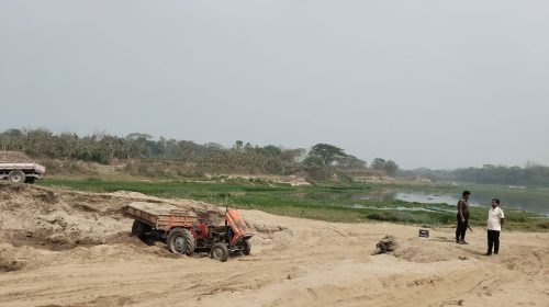 মনোহরদীতে নদীর জমি থেকে অবৈধ বালু উত্তোলন: ট্রলি ও ব্যাটারি জব্দ