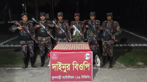 ফুলবাড়ী ব্যাটালিয়ন (২৯ বিজিবি)-এর অভিযানে প্রায় ৮ লাখ ৯০ হাজার টাকার মাদক ও চোরাচালানী মালামাল আটক
